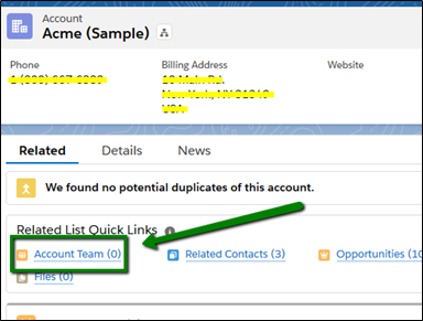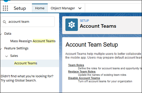 - Go to “Setup” and in the quick find box enter : “ Account Teams ” and click on it.