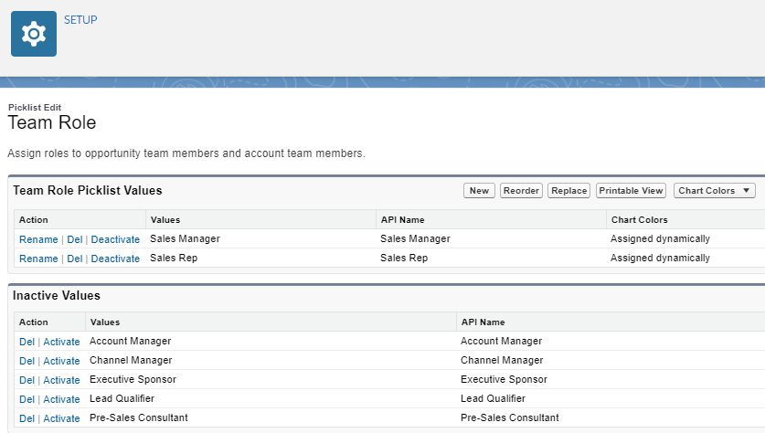 - In order to add them, go to the “Account Teams” in the Setup menu and click on “Team Roles”