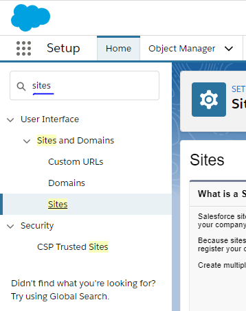 - On the left pane, type “sites“ in search bar and click on “Sites“ under “Sites and Domains“
