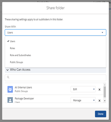 - Pick Users, Roles, Groups to provide an access to the folder, choose the access level, click on "Share" and finally on "Done."