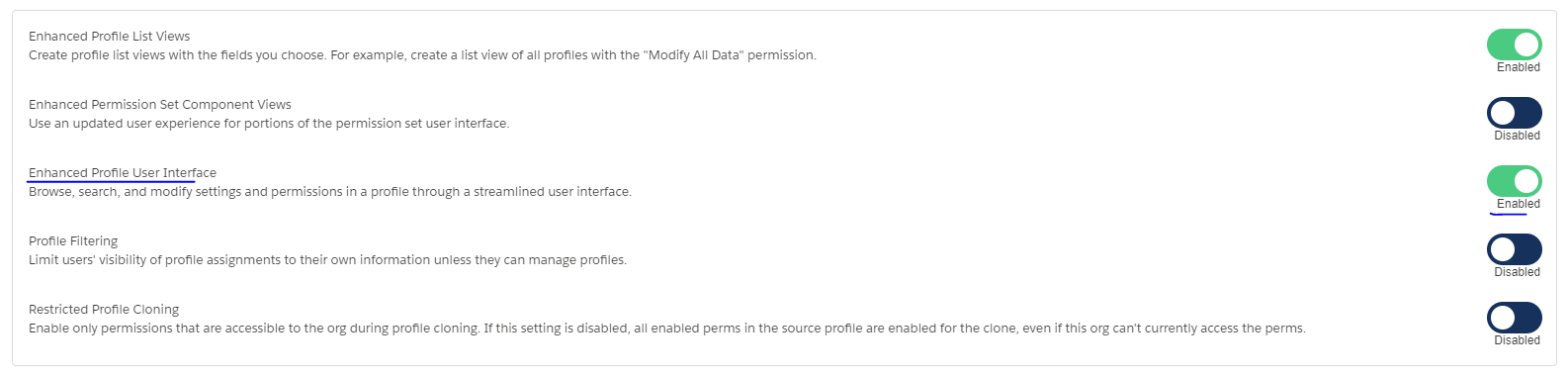 - Ensure that “Enhanced Profile User Interface” is enabled