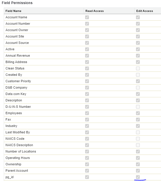 - Open each object shown in Salesforce list according to the list provided below in the document and make sure that this user has the “Edit“ permission for following field present.