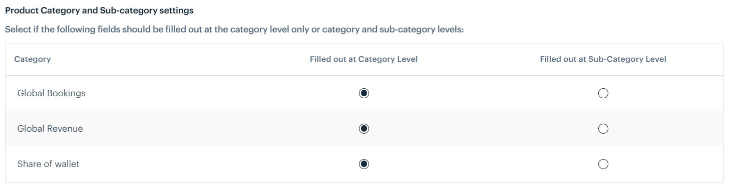 Of note, if you choose to fill-out the Share of Wallet information at a category level, sales reps will only be prompted to enter estimated share of wallet at the Category level.